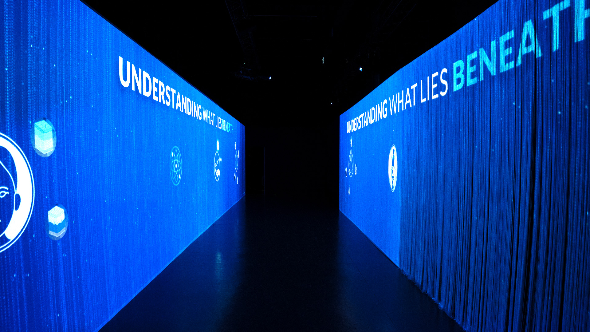 At the Black Hall of Superstudio, guests were welcomed through a digital tunnel where fresh scents and visuals introduced them to the app experience. In the main hall, a large central screen with two side wings surrounded the audience with images, videos, and music designed to stir emotions and prepare them for the training journey.