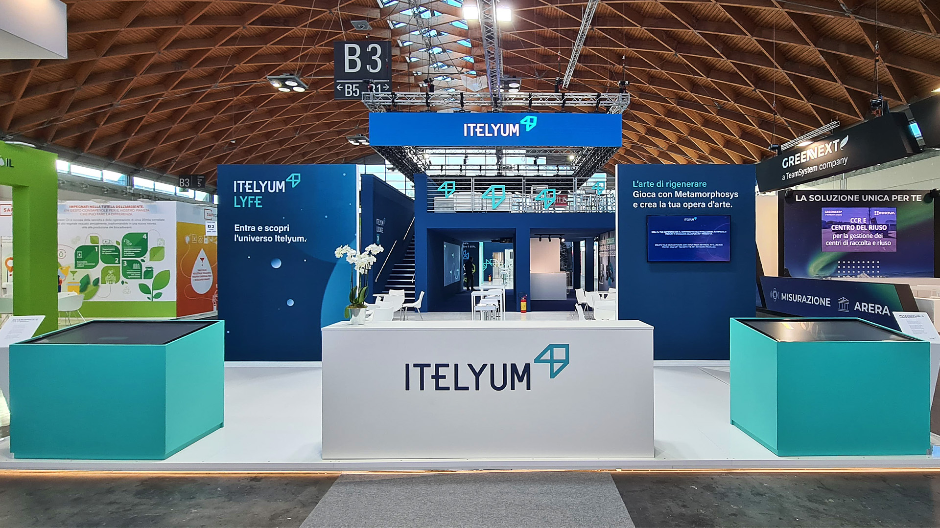 Studeo group designed and built the multimedia booth of the Itelyum company present at the Ecomondo 2023 fair in Rimini, the fair dedicated to the ecosystem and the ecological transition.