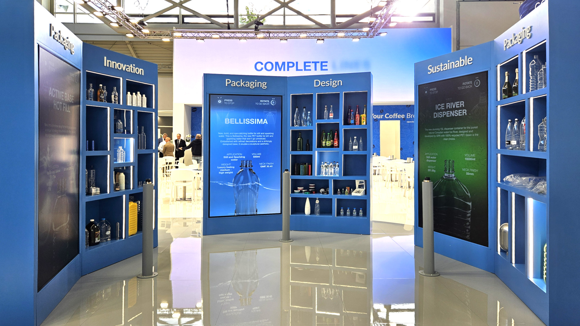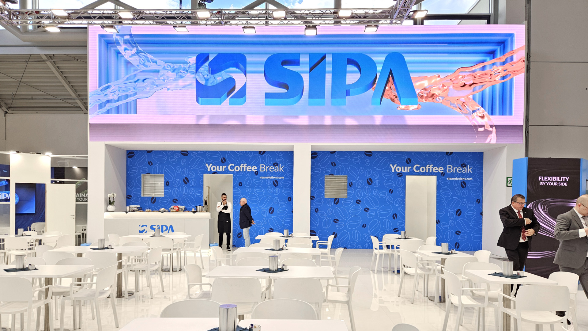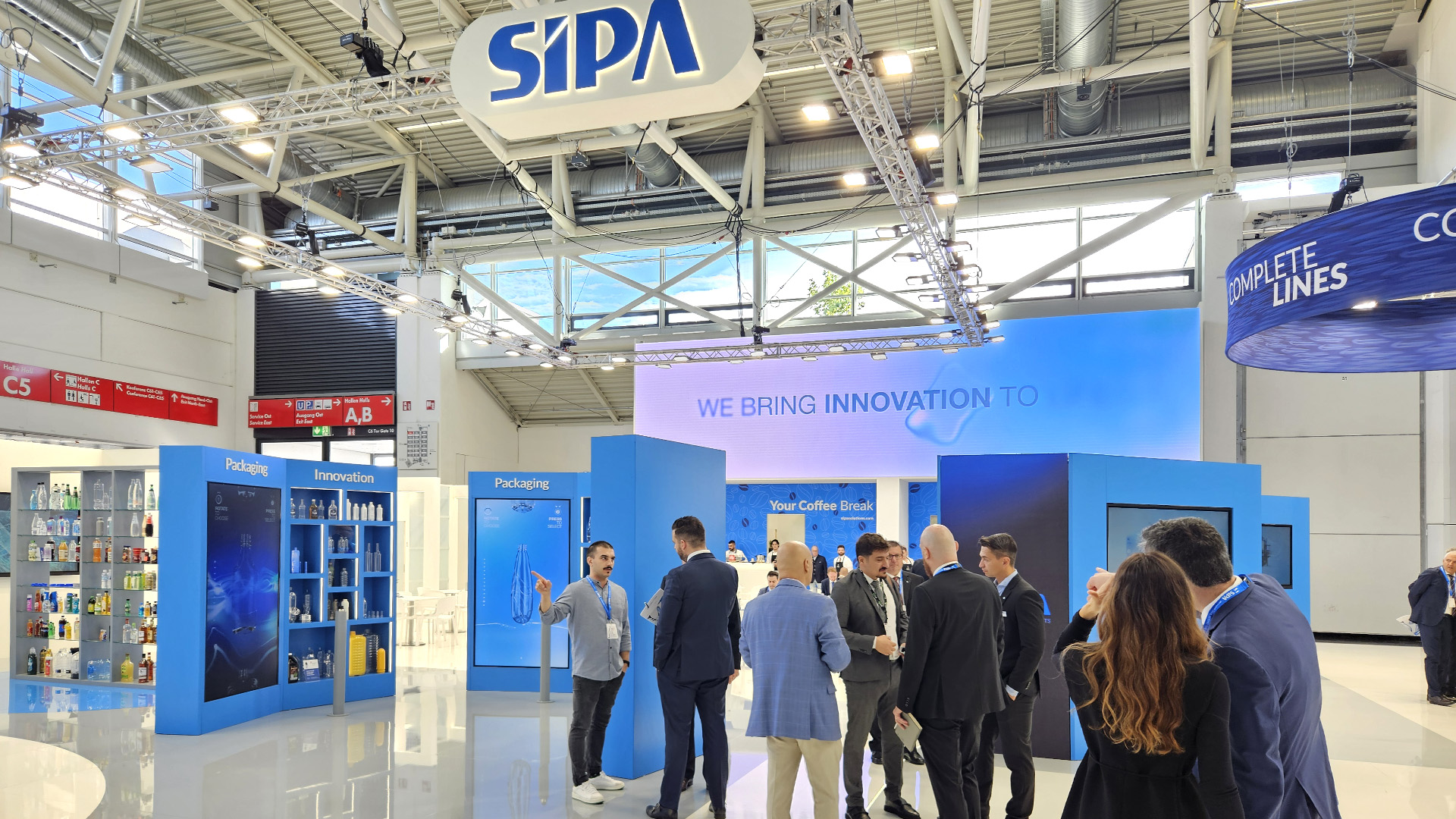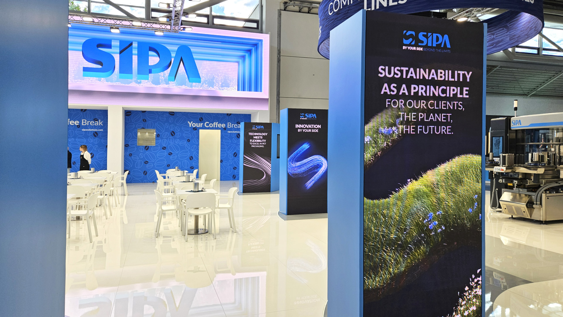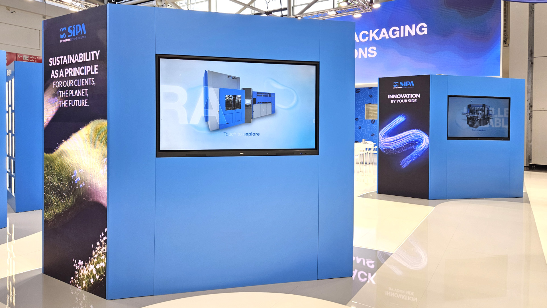 At the center of the booth, we designed an interactive station that welcomes visitors and invites them to discover the various types of packaging produced by SIPA, showcased in three thematic areas dedicated to Design, Sustainability, and Innovation. An interactive slider allows users to select their desired container, displaying it in large format on an 86-inch monitor while simultaneously lighting up the corresponding physical item inside the display cases. With a simple gesture, the same control tool also opens the product’s technical data sheet, revealing all its features and specifications.